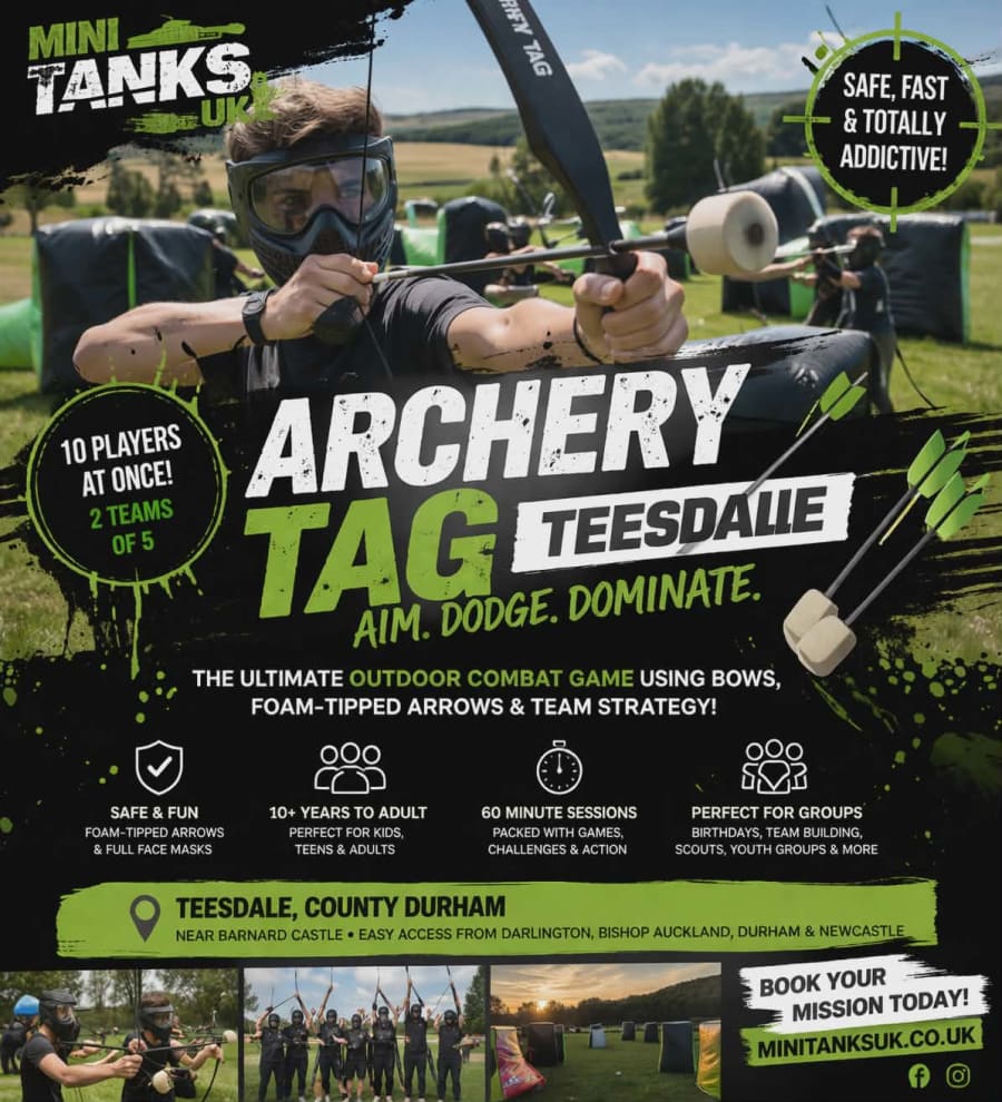 Looking for Archery Tag hire in Durham? Mini Tanks UK provides exciting, fully mobile Combat Archery Tag experiences across County Durham, bringing high-energy, action-packed fun directly to your venue.